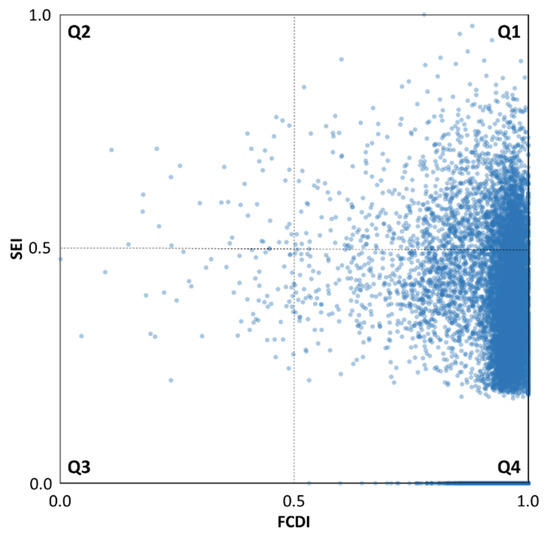 Binary scatter plot of SEI (the shannon entropy index) and FCDI (the functional compatibility degree index) values of parcels in the study area.