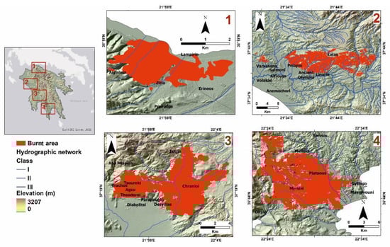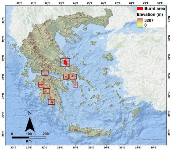 In the Aigialeia region, post-alpine sediments are exclusively found, mainly marls of the Pliocene–Pleistocene age, sandy clays and Quaternary conglomerates [1]. Land cover in the burnt area includes coniferous and shrub vegetation and cultivations, their proportion being almost equal [83]. Artificial surfaces, primarily railways and motorways, mainly occupy the coastal part of the region. A total of 3 Km2 were burnt, including the settlements of Lampirion, Ziria, Ano Ziria and Kamari [84].
