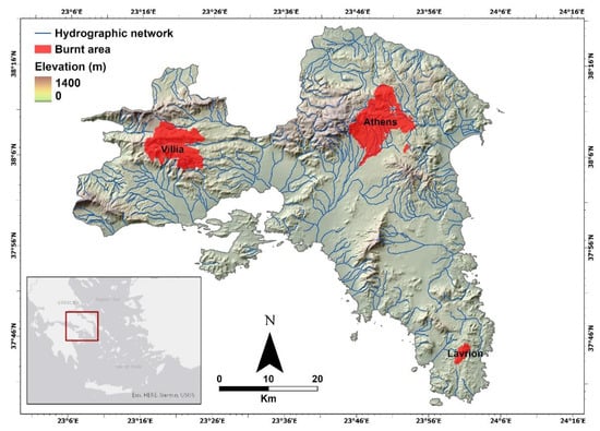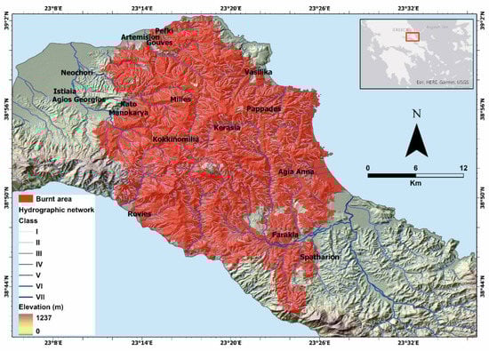 According to the aforementioned, land cover did facilitate the spreading of the forest fires, in association with the heat waves that had previously affected Greece. Regarding the fire-affected areas of Attica Prefecture, they host well-developed drainage systems, partly draining urban areas. There are two main hydrographic systems in the wider area of Varympompi area (Figure 2). The main drainage networks are the Oinois river, flowing towards Marathon, and Kifissos river, flowing towards the western suburbs of Attica. In the fire-affected area in Villia, a drainage system crosses it for about 10 Km in an East–West direction, and finally ends up in the area of Elefsina. There are also smaller catchments passing through the fire-affected area, flowing towards Nea Peramos (Figure 3).