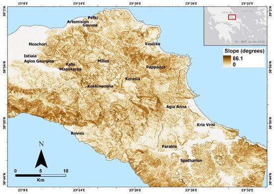 The morphological slope distribution of Euboea is shown in Figure 6. Large slopes cover more than half of the fire-affected areas. Moreover, 63.1% of the slopes have an inclination between 10° and 30° (medium slopes), and 14.5% of the total area is characterized by low slope, with inclinations fluctuating between 10° and 4°, whereas 5.8% is characterized by an inclination of less than 4° (very low slopes). The remaining 16.6% of the area’s slopes have an inclination of more than 30° (high slopes).