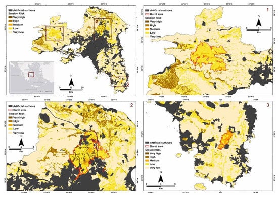 Results of erosion risk in the fire-affected area of Attica using a Boolean logic-based model. The map on the top right shows the erosion risk in the total investigated area, and the numbers correspond to the other three individual maps, where (1) is Attica, (2) is Villia and (3) is Lavrion.
