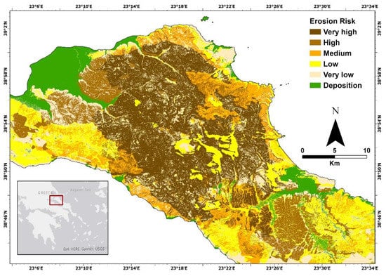 In addition, land cover refers to both land use and land management. Land cover primarily regards vegetation characteristics. For example, the denser the vegetation cover, the higher the protection it offers against soil erosion. This means that forest areas are less vulnerable to erosion than shrubs. Land management refers to the applied land techniques. An area covered by forests is much more protected than an agricultural area, which is, in turn, less susceptible to erosion than an urban area. Even in the case of agricultural areas, there are many subcases. A cultivated area is more easily eroded than a non-cultivated agricultural area [51]. Furthermore, different agricultural practices bear a different impact on the soil’s vulnerability to runoff erosion [52]. For example, tilling techniques generally lead to an increase in the sand’s proportion in the soil, as well as a decrease in the soil’s permeability [53,54]. In addition, overgrazing reduces an area’s protection against soil erosion. On the contrary, the creation of artificial terraces is very helpful in reducing the negative effects of flowing water. Increasing the soil’s roughness can also be protective. Finally, another human intervention that severely affects an area’s susceptibility to runoff erosion are extensive fires, although they may also occasionally be owed to natural causes. It has been proven that almost any region is far more vulnerable to erosion immediately after a fire. A conflagration results in the reduction of both vegetation and biomass protective cover. This means that all types of protection against erosion are diminished. Therefore, all areas are far more susceptible to erosion, as well as floods, after a conflagration.
