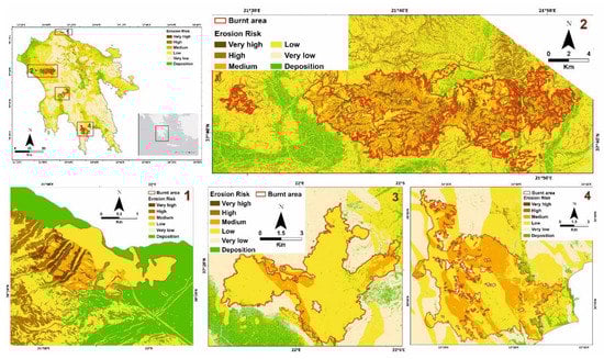 Results of erosion risk in the fire-affected area of the Peloponnese using a Boolean logic-based model. The map on the top right shows the location of the investigated areas the numbers corresponding to the other four individual maps, where (1) is Aigialeia, (2) is Ancient Olympia, (3) is Diavolitsi and (4) is Eastern Mani.
