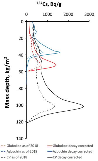The 137Cs activity concentration in the sediment core layers above the peak slowly declines up to the surface sediment layer, as can be seen from Figure 2, which reflects temporal changes in particulate concentrations in the water column after the accident. Some minor deviations can be noticed for Lake Azbuchin and CP, yet not contradicting the general trend. There are also secondary maxima in the 137Cs activity concentrations, which are likely to be associated with water level manipulation and other remediation activities, as well as changes in the ChNPP operational mode [].