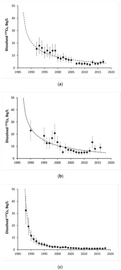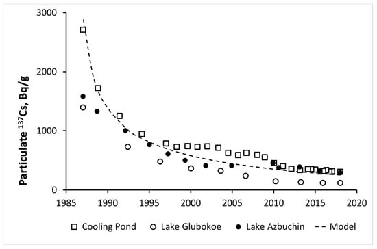 The reconstructed data, in addition, can be used for testing the semi-empirical diffusional model (Equation (2)) accounting for dynamics of particulate 137Cs concentrations in water bodies [,]. The obtained data help to ascertain that the processes and mechanisms described by this model really occur in the studied water bodies and therefore the model can be used for prediction purposes. The 137Cs particulate concentrations as a function of time in the water bodies, calculated by the model at = 3000 Bq∙(y)1/2g−1, are shown in Figure 4 (dashed line).