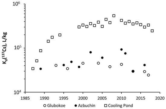 The obtained Kd (137Cs) time dependence for the cooling pond is most likely to be due to CP maintenance features. The mode of ChNPP operations changed significantly and consequently the circulation, thermal, hydrological, and hydro-chemical conditions in CP changed too. In the years following the initial phase, the Kd (137Cs) value in the suspended matter–water system of CP was approximately an order of magnitude higher than those typical of other water bodies in the ChNPP zone [].