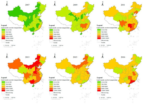 Data about the TLT area (the newly transferred transportation land per year) were sourced from the China Land Market Network [59], which is the dynamic system that monitors the Chinese land market. The system integrates information release, monitoring and analysis, and sharing services, including data information, policies and regulations, and news about land supply in national and key areas. The China Land Market Network is the most comprehensive, timely, and accurate government website with information about China’s land market. The TLT area serves as the core explanatory variable and measures the supply of transportation land in each province. According to the “Guidelines on the Classification of Land for Land Use for Territorial Space Investigation, Planning and Use Control”, issued by the Ministry of Natural Resources in December 2020, transportation land generally includes the following nine types of land use: railway, highway, airport, port and wharf, pipeline transportation, urban rail transit, urban roads, transportation station, and other transportation facilities.