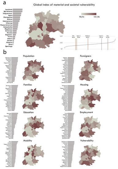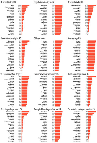 - Aggregation by groups does not identify any relationship between the indices other than by nature (population, work, housing, income, real estate values); these indices, taken individually, have a quantitative significance at a low informative level. Many of them use others of the same group and therefore not all of them are independent from each other; consequently, the significance of their simple aggregation by weighted averages could be affected by the “weight” they assume, as they are also indirectly involved in the formation of other indices.