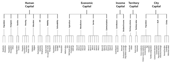 - Arrangement of the criteria dendrogram, having as root criteria the five forms of capital: Human, Economic, Territorial, Income, City, and as leaf criteria the indices coming from the different sources, connected at the root by their specifications (branches) consistent with the aforementioned forms of capital;