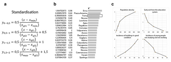 - Attribution of the leaf scores to each territorial unit by means of the polarized polylinear normalization of the indices referring to their variation ranges of these within the municipal territory, by means of comparison with the values of all municipalities of the entire provincial territory;
