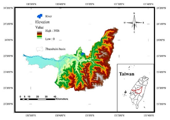 The basin covers an area of 3257 square kilometers and is located in central Taiwan. It is the longest river in Taiwan, with a total length of 186.6 km and an average annual rainfall of about 2459 mm. Figure 1 shows the scope of the study area; the terrain has a large elevation difference, the main slope is six grades (>55%), and the highest elevation is 3926 m. The flowing water carries a lot of sediment, which causes turbidity in the four seasons.