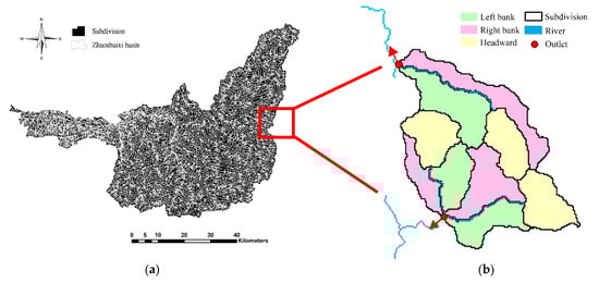 Analysis unit division: (a) spatial distribution of the specific watershed and (b) subdivision of the specific watershed.