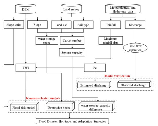In recent years, Taiwan has established a sound flood control foundation in terms of river management. Due to climate change and land development, surface runoff has increased. In addition, the functions of flood control engineering facilities have their limits. Surface runoff cannot be fully absorbed by rivers, and frequent floods still occur in some areas. According to the characteristics of water flowing along the terrain to low-lying land, the terrain features can be used to find out the hot areas prone to flooding and the appropriate location of flood storage space for improving flooding. On the basis of the natural terrain environment, the disaster risk framework is used to manage environmental complexity, and to carry out research on flood warning and governance decision-making systems, so that human beings can coexist with the uncertainty of flood risk. In this study, the Zhuoshuixi Basin was used as the sample area, the SCS-CN method was used to analyze the excess runoff, and the risk concept was used to establish a flood evaluation model. In addition, through the changes in land use, the SCS-CN method estimates the difference of potential maximum retention, quantifies the variation of excess rainfall in each watershed division, and uses the digital elevation model to calculate the depression site to analyze the relationship between the difference of potential maximum retention and the depression space of the watershed. The results show that the adaptation strategy for high-risk flooded areas should be strengthened, and areas with large water storage space and a small potential maximum retention difference can be the best location for offsite compensation.