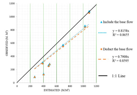 Using the SCS-CN method to estimate the excess runoff can quickly calculate its spatial distribution in the watershed. The distribution of flow stations in the basin (Figure 6) shows that the Chun-Yun bridge station is the main tributary confluence. Compared with other stations, the watershed runoff in the station changes greatly, and the water flow conditions are more complicated. Therefore, with Chun-Yun bridge station as the control point, the relationship between the estimated excess runoff and the measured flow was established. The results can better reflect the advantages of this research model. Based on the observed flow and estimated flow of the largest rainfall event in the past 8 years, the influence of the base flow is considered, as shown in Table 4 and Figure 7. The relationship equation shows a positive correlation (R2 = 0.8655), and the horizontal base flow separation method is used to separate the base flow, and to then perform a correlation analysis with the measured flow. The result also shows a high degree of positive correlation (R2 = 0.8595). It can be seen that the separation of base flow has no significant difference in the estimated runoff trend. The linear regression shows that the two slopes are 0.8158 and 0.7908, respectively, which means that the estimated runoff is slightly larger than the actual observed runoff. The excess runoff is mostly below the 1:1 slope line. The reason may be that the model is based on the consideration of surface infiltration capacity and does not consider large depressions such as lakes and reservoirs, resulting in an overestimation compared with the observed runoff [38]. The main reservoirs upstream of Chun-Yun bridge station include Wu-She reservoir, Wu-jie dam, Sun Moon Lake reservoir, Jiji weir, and Hu-Shan reservoir. The total effective storage capacity of the reservoir is 222.7 M.M3. From the viewpoint of adjusting the storage capacity of reservoirs during the flood season, the difference between the estimated and measured runoff (Table 4) is between 37.2~280.6 M.M3, which is also consistent with the reservoir. In line with the deviation range caused by the flood storage operation of the reservoir, this can reasonably explain the main reason for the deviation.