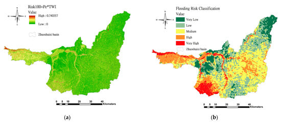 Most of the river embankments in the Zhuoshuixi Basin have been constructed, and the flooding incidents are mainly low points affected by the terrain. In order to understand the movement of runoff through the terrain, there should be an overall catchment monitoring mechanism. Risk analyses are performed to satisfy regulatory requirements [27]. According to the risk concept in IPCC (2014), a quantitative risk model can be provided for disaster risk analysis. Take the excessive runoff that causes flooding disasters as the hazard, and when the surface excess runoff is generated, its value is equal to the excess rainfall (Pe), and the topographic wetness index (TWI) refers to the control of soil moisture by topography. The soil moisture content can be reflected through the terrain, that is, the smoother the slope, the higher the soil moisture content, and the easier it is for runoff to collect and form flooding, which is then used as a vulnerability. In terms of the movement pattern of surface runoff, all areas of the movement path are exposed to risks. The model can be expressed as follows:
