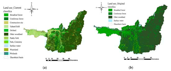 The land use map provided by the National Land Surveying and Mapping Center is divided into 12 types of coverage, including upland field, parks, wasteland, water area, coniferous forest, and other woodland. Other woodland is the main land use type, and its area accounts for about 60% of the Basin area, as shown in Figure 10a. In order to explore the change of land use from the most primitive situation to the current situation, the vegetation morphology classification method [39] is used to estimate the land use situation in the watershed without human development so as to determine the distribution of the original forest plants (Figure 10b). The SCS-CN method (Equation (4)) is used to estimate the difference in CN between the two periods and to convert the difference between the water storage capacities (S), as shown in Figure 10c–f. The larger the S value, the better the permeability of the surface layer, and the easier it is to infiltrate and retain water.