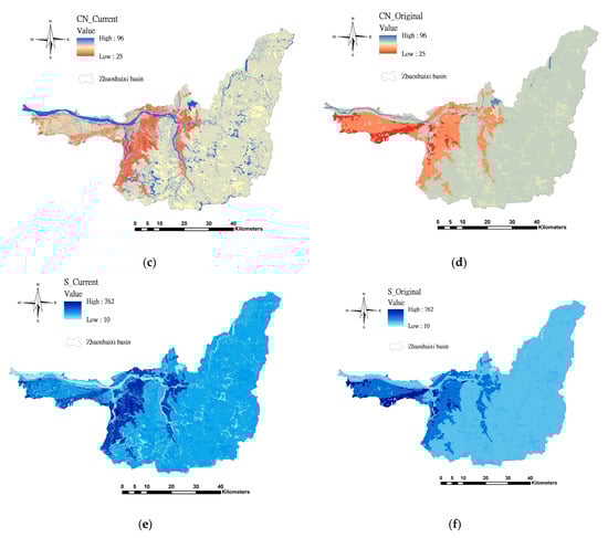 Basic map data under current and original conditions: (a) current land use map, (b) original situation land use map, (c) current situation CN value, (d) original situation CN value, (e) current situation water storage capacity, and (f) water storage capacity in the original situation.
