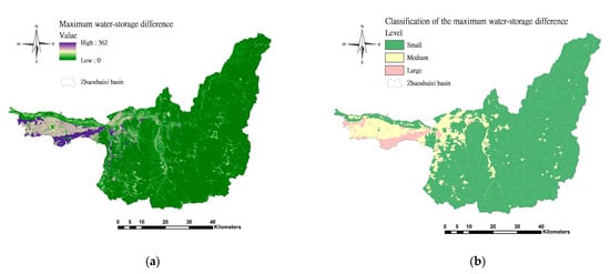 Figure 11a shows the maximum water storage difference in the Zhuoshuixi Basin, and is obtained by subtracting the water storage capacity under the current conditions and the original conditions. Through this value, the increase in runoff caused by land use changes in the two periods can be reflected. The upper reaches have less development due to steep slopes, resulting in less runoff increments; the middle and lower reaches have more flat land, and some urban developments are hotter, resulting in an increase in impervious area. For the effective management of the watershed, the difference in storage capacity is divided into large, medium, and small levels using management zoning and K-mean cluster analysis, of which the area accounts for 2.3%, 11.7%, and 86.0%, respectively (Figure 11b).