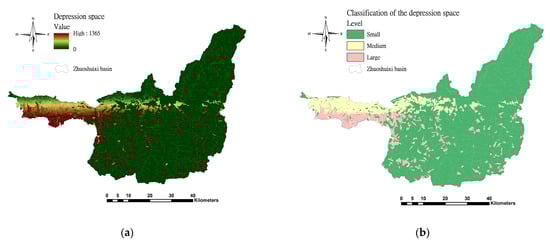 The depression space distribution extracted by DEM and land use map data is shown in Figure 12a. Using k-mean cluster analysis, the depression space is divided into three levels, from large to small, accounting for 8.6%, 10.1%, and 81.3% respectively. The depression space in the middle and lower reaches of the basin is gradually decreasing, as shown in Figure 12b, as it gets closer to the mainstream.