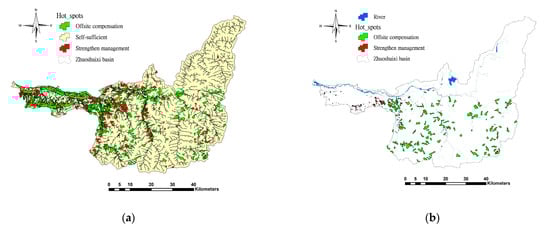 Through the classification matrix, the construction locations of various types of catchment areas can be obtained, and the key construction locations can also be known. In the case of limited governance funds, taking into account the maximum benefit and priority, the area with the smallest difference in water storage capacity and the largest water storage space is selected, and the best area for off-site compensation is 124 square kilometers. For the area with the largest difference in water storage capacity and the smallest water storage space, the suitability evaluation of land development and management should be carried out, which is 9.7 square kilometers, as shown in Figure 13b.