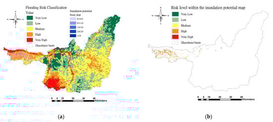(a) The spatial relationship between the flooding potential map and the model results of this study and (b) the range of the flood potential map corresponds to the risk level of this study model.