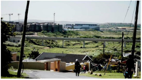 The Bridge City development is located on the ridge above the adjacent Piesang’s River valley within the historical Apartheid “buffer zone” [60]. Apartheid planning took advantage of the natural separation of areas through topography and riverine systems to enforce racial segregation. The name “Bridge City” was chosen to stress the concept of bridging this divide (see Figure 2).