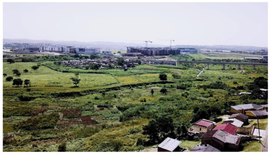 One of the challenges for the Bridge City development has been precisely the crossing of the Piesang’s River flood plain [61]. Over a length of nearly 2 km, there is no pathway or pedestrian bridge over the Piesang’s River to allow the population of old-town KwaMashu to safely cross the river and steep slopes to reach the facilities of Bridge City [65]. Additionally, part of the protected biodiversity of the Durban MOSS green space is in a state of neglect and is perceived to be a dangerous, no-go area (see Figure 3).