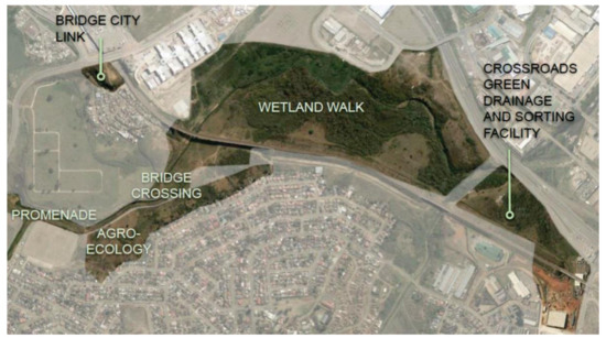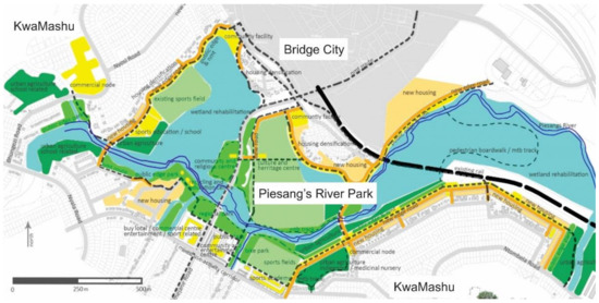 The Open Space Project aims to develop the Piesang’s River valley into a major park, which needs to respond to regular flooding and has a reinstated and protected wetland in its center (see Figure 4). The rehabilitated wetland would improve the above-mentioned regulating services and add additional supporting services of habitat and increased biodiversity. New and sometimes conflicting uses are required. Cultural services include safe spaces for sports, rest and recreation for the surrounding communities, and infrastructure for pedestrians and cyclists, such as pathways and pedestrian bridges to reach Bridge City. The design would require intangible aspects such as respect for the cultural heritage (e.g., cemeteries) to retain the urban identity and foster a sense of place [67]. Provisioning services required include designated allotments for urban agriculture and food security. A Spatial Framework Plan (Figure 4) and subsequent spatial designs were developed to encourage sustainable and affordable non-motorized transport and support economic opportunities and green jobs.