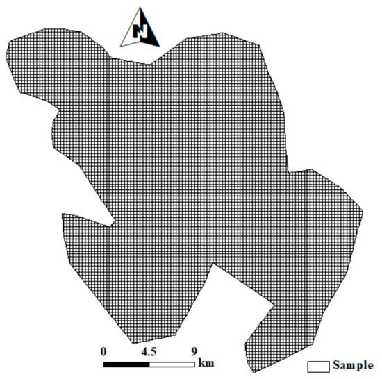 Using ArcGIS software, a fishing net of 300 × 300 m was established as the sampling unit, with a total of 7796 samples for the study area (Figure 2). The Zonal Statistics as Table tool was employed to summarize the average values of all rasters within each sample of the datasets of each variable, and the statistical tables for all the variables were output. Then, all average values in the output tables were joined to the sample layer on the basis of the predetermined field. Thus, the sample layer had the attributes (i.e., the average value) of all variables at 300 × 300 m polygons, which can be used as an input feature in modeling spatial relationships in ArcGIS.