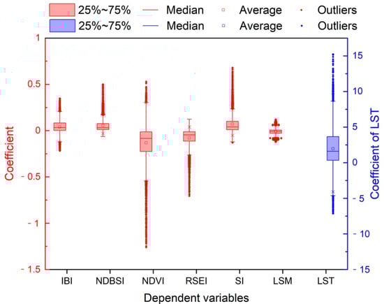Figure 3 presents parameter descriptive statistics of the GWR models. These statistics can be used to compare the coefficient changes in different variables and reveal the variation in the coefficients in the study area. Specifically, the impacts of KDR on all the RSEI indicators were both positive and negative across the study region. Excluding the variable of LST, whose values were not between −1 and 1, the impacts of KDR on the other variables (from large to small) were in the order of NDVI, RSEI, SI, NDBSI, IBI, and LSM. The average effect of KDR on the variables of NDVI, LSM, and RSEI was negative, while it was positive on the variables of IBI, SI, NDBSI, and LST.