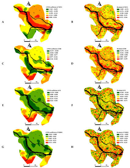 Geographically weighted regression (GWR) coefficient and residual of different ecoenvironmental indicators against kernel density of roads (KDR). (A,B) Normalized difference vegetation index (NDVI) against KDR; (C,D) index-based built-up index (IBI) against KDR; (E,F) soil index (SI) against KDR; (G,H) normalized differential build-up and bare soil index (NDBSI) against KDR; (I,J) land surface temperature (LST) against KDR; (K,L) land surface moisture (LSM) against KDR; (M,N) remote-sensing-based ecological index (RSEI) against KDR.