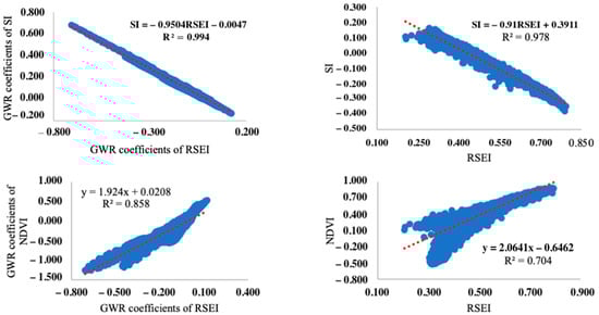 Scatter plots of coefficients of remote-sensing-based ecological index (RSEI), soil index (SI), and normalized difference vegetation index (NDVI).