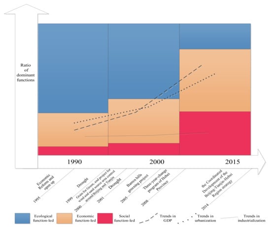 - Fan, Y.; Jin, X.; Gan, L.; Jessup, L.H.; Pijanowski, B.C.; Yang, X.; Xiang, X.; Zhou, Y. Spatial identification and dynamic analysis of land use functions reveals distinct zones of multiple functions in eastern China. Sci. Total Environ. 2018, 642, 33–44. [Google Scholar] [CrossRef]