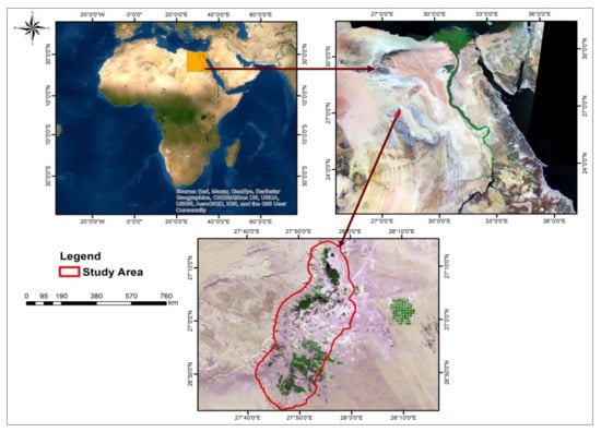 El-Farafra is one of the inland oases in the Egyptian western desert, approximately midway between the Dakhla and Bahariya oases. The study area was conducted in 987.77 km2 (Figure 1). The geographic location is in the UTM zone 35 between longitudes 27°39′41″ to 28°00′17″ E and latitudes 26°43′07″ to 27°14′45″ N. The climate in the investigated area is ordered as hot desert, the minimum temperate is 6 °C and occurs during January, while the highest is 39 °C and occurs during August. The mean annual temperature is 22.92 °C and the total annual rainfall is 0.25 mm. The mean annual potential evapotranspiration (PET) is 6.14 mm day−1. The mean annual relative humidity averages 36.33%, while the mean annual wind speed is 8.18 km h−1 [25]. The area is covered by sedimentary sequences of Upper Cretaceous to Quaternary eras. In the western parts, chalky limestone of Tarawan Formation (Paleocene), Farafra limestone (Eocene) and Esna shale Formations (Miocene) are predominant. The remaining parts are covered with chalk of Upper Cretaceous (Dakhla and Khoman) and Quaternary Formations (Sabkha). The elevation height ranges from 42 to 342 m above sea level.