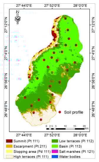 Twenty-eight geo-referenced soil profiles (Figure 2) were dug to a 150 cm depth or to lithic contact. General features of each profile were recorded according to the Food and Agriculture Organization of the United Nations (FAO [27]. Ninety-three soil samples were collected from the subsequent horizons. Thereafter, samples were air-dried, ground, and sieved through a 2-mm mesh. Soil analyses were carried out according to the Soil Survey Staff [28]. The particle size distribution was performed using the standard pipette method. pH and electrical conductivity (EC) were measured in the 1:2.5 soil-water suspensions and in the soil paste extract, respectively. The soil organic matter (OM) was determined using the standard Walkley–Black procedure. The cation exchange capacity (CEC) and exchangeable sodium were determined using the ammonium acetate pH 7.0 method. Calcium carbonate was determined using the calcimeter. The gypsum content was determined using the acetone precipitation method. The studied area was classified into four main landscapes (physiographic units) i.e., Plateau (Pt) that divided to Summit (Pt 111) and Escarpment (Pt 211); Piedmont “Slopping area” (Pd 111); Plain (Pl) that divided to High terraces (Pl 111), Low terraces (Pl 112), Basin (Pl 113) and Salt marshes (Pl 121) and Water bodies (Wb).