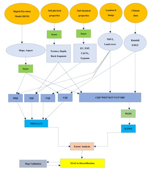 - Kosmas, C.; Ferrara, A.; Briassouli, H.; Imeson, A. Methodology for Mapping Environmentally Sensitive Areas (ESAs) to Desertification. In The Medalus Project—Mediterranean Desertification and Land Use’. Manual on Key Indicators of Desertification and Mapping Environmentally Sensitive Areas to Desertification; European Commission—Office for Official Publications of the European Communities: Luxembourg, 1999; pp. 31–47. ISBN 92-828-6349-2. [Google Scholar]