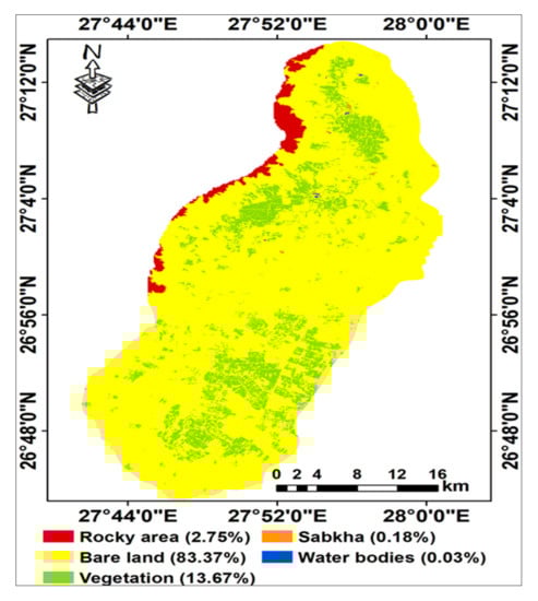According to three classification methods i.e., Parallelepiped, Mahalanobis Distance and Maximum Likelihood with overall accuracy of 96.15%, 91.31% and 97.59%, respectively, and Kappa coefficient of 0.95, 0.88 and 0.97, respectively, the best classification method is Maximum Likelihood, and according to these results, the investigated area was dominated by five land cover classes: rocky areas, bare land, vegetation, sabkha and water bodies (Figure 4). They occupied 27.15, 823.53, 134.98, 1.78 and 0.33 km2, representing 2.75, 83.37, 13.67, 0.18 and 0.03% of the total area, respectively. The natural vegetation occurred in small scattered areas covered with perennial grasses (Arundinoideae) around the lakes and halophytic species (Chenopodiaceae) of the sabkha. According to the official statistics, field crops dominated 69% of the total cultivated area of which a perennial crop (alfalfa) covers 15%, while annual crops (wheat, barely clover, broad bean, maize, sorghum, and groundnuts) cover 54%. The remaining area was occupied by orchards (19%); mango, date palm, guava and timer tress, and vegetable crops (13%); potato, tomato, onion, and arugula.