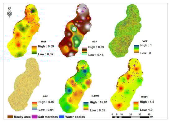 Results in Figure 6 show values of the five parameters used for calculating the ILSWE; CQF, WEF, SCF, VCF, and SRF. Combining the five factors, the ILSWE ranged from 0.05 to 15.81 Mg ha−1 year−1, which demonstrated very slight to moderate wind erosion severity. These values were transformed to the corresponding WEPI (Table 5) with a range of 1.00 to 1.50, indicating very high to moderate quality. According to the WEPI, 90.90% of the total area was classified as high (areas with slight erosion severity), 1.07% as very high (areas with very slight erosion severity), and 5.13% as moderate (areas with moderate erosion severity).