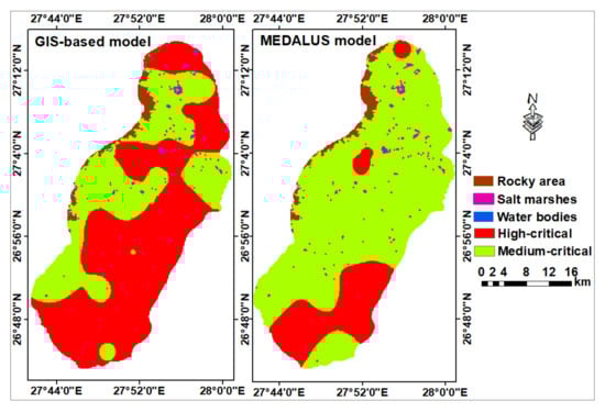 Validation was performed by comparing results of the developed model against those obtained by the environmentally sensitive area index (ESAI) provided in the original MEDALUS model. The geometric mean algorithm of the five quality indices were used for calculating the ESAI as follows: