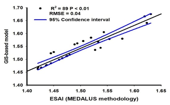 The statistical analysis indicated no significant differences (p < 0.01) between the proposed model and the ESAI. Furthermore, values of R2 and RMSE (Figure 8) were 0.89 and 0.04, respectively, which demonstrates a high correlation between the estimated values from both models. However, the sensitivity analysis (Figure 9) revealed that the outputs of the proposed model showed higher values of ALS to the five indices rather than those obtained by the ESAI.