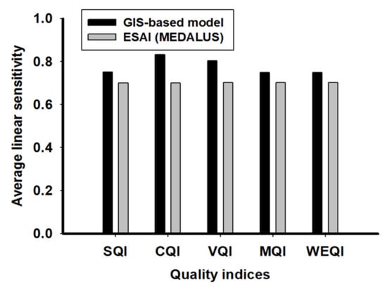 The CQI indicated low climate quality due to low rainfall and high evaporation rates; since the annual precipitation and aridity index are constant across the area, the slight variation in the CQI value was due to the slope aspect. The high values of CQI occurred within the southern and western aspects, which are warmer and have higher evaporation rates and lower water storage capacity than the northern and eastern aspects [7]. For VQI indicating moderate to very low vegetation quality, areas of very low vegetation quality covered nearly 96% of the total area, while low quality areas covered about 1% of the total area. Spatial variations in VQI related mainly to the NDVI since other factors (fire risk, erosion protection, and drought resistance) were similar due to a similar crop pattern. The NVDI derived from remotely sensed images has been used as a good indicator for monitoring and forecasting vegetation patterns in regions at risk of desertification [11,12]. This can reflect the spatial distribution density of surface vegetation and provide the growth status and coverage information for the plants being grown [45,46]. Areas of high land management quality (MQI) covered 77.62% of the total area, while those of moderate quality occupied 19.48%; this spatial variation related mainly to the land use intensity rather than the protection policies. Two types of land use intensity were identified in the area depending on the frequency of irrigation, degree of mechanization, use of pesticides and fertilizers, crop varieties, etc. [7]. They included low land use intensity on the small farms managed by local farmers and medium land use intensity on the large-scale farms owned by investors. However, there was incomplete enforcement of the policies on environmental protection across the area. The major factor of land degradation in Kafr El-Sheikh Governorate, North Nile Delta, Egypt was soil sealing; therefore, a Fuzzy model was used to assess quantitative land degradation caused by soil sealing. Land degradation caused inappropriate agricultural practices mainly associated with conservation measurements as well as improper time use of heavy machinery, over irrigation, and human interventions in natural drainage [47,48,49].