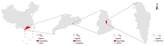 Duozhu Town is a tourist-oriented town featuring the development of rural tourism and ecological agriculture in Guangdong Province, China. It is also the gateway to the northern mountainous region of Huidong County and a distribution base for agricultural and trade products. The object of our study is Xiapu Village, which is located in Duozhu Town (Figure 1). The overall topography of the study area is characterized by gentle slopes with a maximum height difference of approximately 240 m. The plain is predominant and interspersed with small hills and hollows. The village is one of the areas where Hakka dwellings are concentrated [62,63,64].