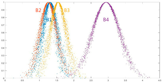 Cloud image of B1–B4. Note: The X-axis represents En (entropy); On the Y-axis is Ex. In the tertiary indicators (B1), C2, C3, and C4 belong to S4 (good), C1, C6 to S1 (very poor), but because the sum of C1 and C15 is small, the sum of C2, C3, and C4 is large, so the environmental value (B1) is “good”.