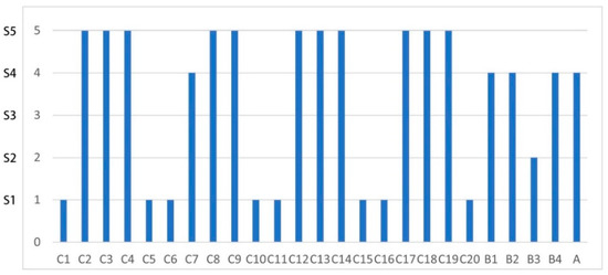 In Table 4, the probability that the C7 indicator belongs to the S3 level is 9%, and the probability of the C7 indicator belonging to the S2 level is 10%. (Of the ten respondents, nine are considered to belong to S3 and 1 to S2.)