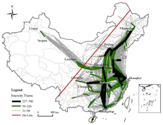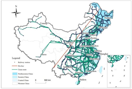 Spatial distribution of China’s railway stations and train routes. (The Hu line in Figure 1 extending from Aihui in Heilongjiang Province to Tengchong in Yunnan Province is a demographic demarcation. The southeast, with 36% of the country’s area, contains 96% of the Chinese population, while the northwest, with 64% of the total area, contains only 4% [42]. The ratios of populations of the two areas have not changed much despite changes in the national territory and massive urban migration in recent years).