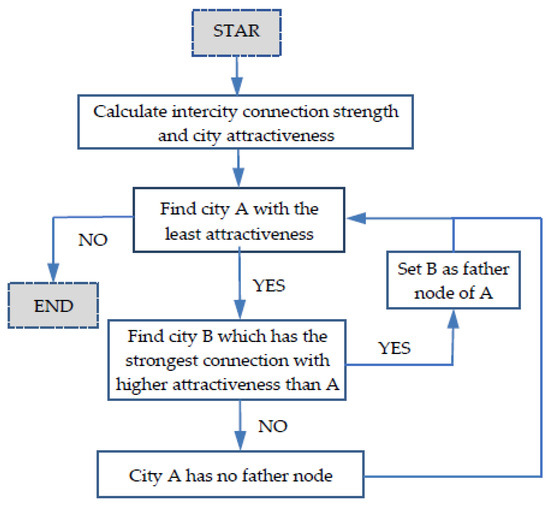 The logic of the algorithm is that if city A is in the hinterland of city B, then city B has higher attractiveness than city A, and among all the cities that have higher attractiveness than city A, city B has the highest connection with city A. City B is set as the father node of city A in the urban hierarchy. The algorithm circulates to find the father nodes of all the cities (except for the root) to build the hierarchy, i.e., a tree. A flowchart of the algorithm is shown in Figure 2.