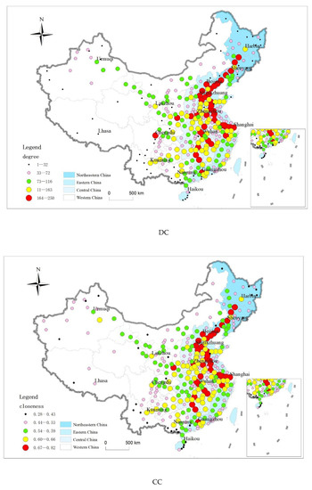 Table 4 gives the rankings of provincial capitals and cities at or above sub-provincial administrative level (excluding cities without HSR stations) in terms of DC in different sub-networks, i.e., CR and HSR. Beijing was ranked the highest in terms of DC in both CR and HSR, which indicates that Beijing had the highest connectivity all the time during railway upgrading. The rankings of cities in northeast China dropped significantly from CR to HSR (yellow signs). Shenyang, the capital of the Liaoning Province in northeast China, ranked fifth in terms of CR connectivity, while its ranking dropped significantly in terms of HSR connectivity. Two other provincial capitals in the region, i.e., Harbin and Changchun, exhibited similar situations. The degrees of change in some western cities are marked with green in Table 4. The rankings of these cities in terms of HSR were on a downward trend compared with CR. Cities with a significant increase in rankings were mainly located in southern China or coastal areas, e.g., Nanjing, Ningbo, and Shenzhen.