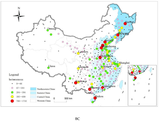 The city centrality values of the indicators of degree, closeness, and betweenness were fitted to the model (Table 2), where y is the centrality, x is the rank of the centrality indicators, and q is the empirical coefficient (slope) that partially captures the rules of distribution of city centrality. The higher the value of q, the fewer cities there are at the highest level of the network in terms of city centrality. Each centrality decreased exponentially, and the DC distribution of cities decreased the most slowly (q was −0.0011), indicating that changes in the accessibility of each city were relatively gentle. Moreover, the fitted curve for BC was the steepest (q was −0.023), and that for CC was in the middle (q was −0.002). The drastic change in BC indicates that a few hub cities undertake most of the transfer function.