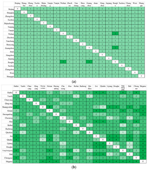 To further analyze the connection between specific cities, a directed intercity network was established to calculate the shortest distance between each city pair (the number of edges along the shortest path). Figure 5a shows the shortest distance between pairs of the top 20 cities in terms of DC (normally developed cities). Most such cities were connected by direct trains. Transfers were required for only a few city pairs, which indicates that it is very convenient to travel between these cities. Figure 5a also shows a certain symmetry, indicating that the incoming and outgoing rail journeys between cities were fairly even. Figure 5b shows the shortest distances between pairs of the bottom 20 cities in terms of DC (normally developing cities). It is clear that commuters between cities in this group usually needed to transfer more than twice to reach their destinations. In addition, compared with developed cities, symmetric transport was absent between developing cities.