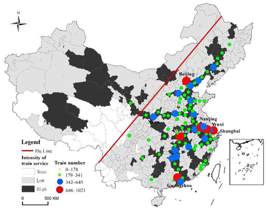 The cities shown in Figure 6 are classified into three groups: (i) cities with a train service proportion greater than the population proportion, (ii) those with a train service proportion less than the population proportion, and (iii) those with no train service. Some of the cities with a high train service intensity were developed cities (such as Beijing, Shanghai, and Guangzhou) and transport hubs (e.g., Wuhan, Zhengzhou, and Xi’an); the others were those along the railway lines that connect developed cities, e.g., the Beijing–Shanghai and Shanghai–Urumqi lines. Cities without train services were mainly located on the Tibet Plateau, which is mountainous and scarcely populated. From Figure 4, most of the trains in service were concentrated in the central and eastern regions, but considering population distribution, China’s train services were evenly distributed across regions.